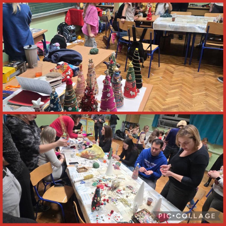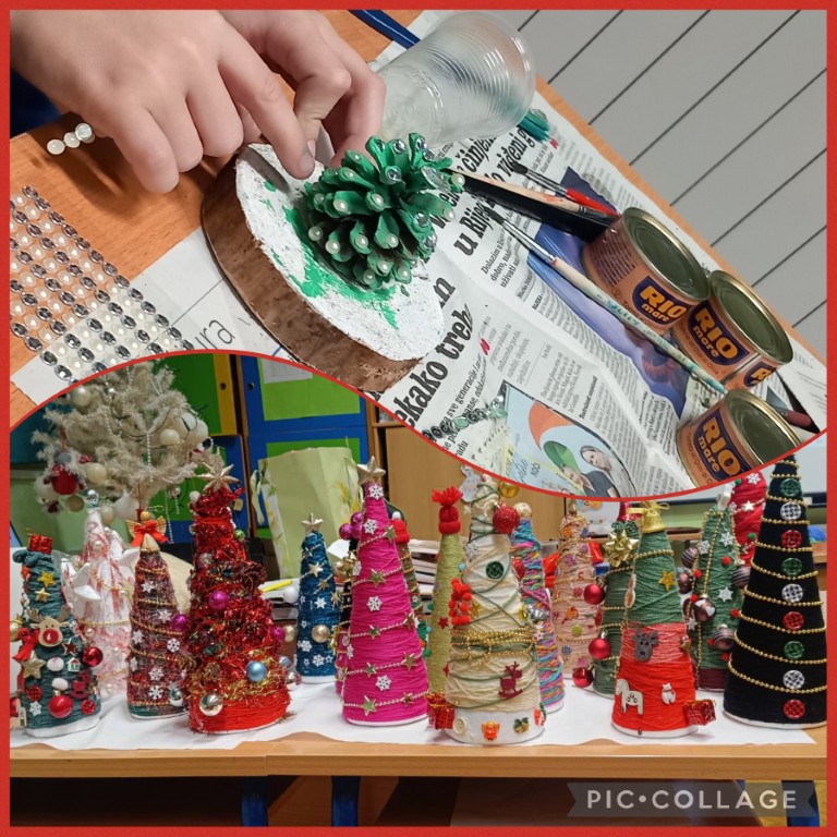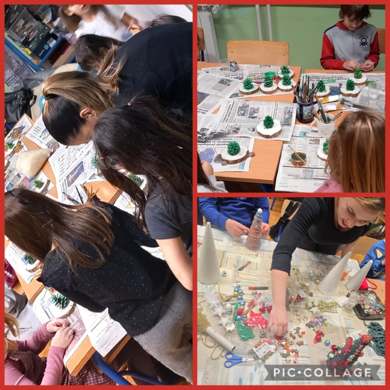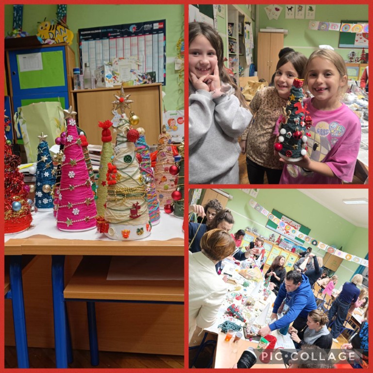Bilo je tu pregršt vune, dugmića, božićnih ukrasa, ljepila i ostalih ukrasa koji su se u tili čas pretvorili u prekrasne ukrase za nadolazeće blagdane. Zahvaljujući vrijednim rukama naših roditelja i učenika, naravno uz pomoć učiteljica izradili smo maštovite borove. Naši Mali ekolozi potrudili su se napraviti ukrase od prirodnih materijala. Ukrasi će se moći uz simboličnu donaciju odabrati prilikom održavanja školske priredbe u srijedu. Donacija će nam pomoći da izradimo novu zastavu za karnevalsku povorku sa novim simbolom škole.