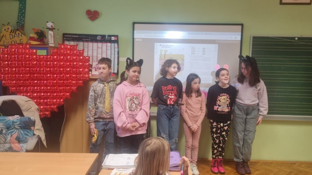 Učenici, polaznici Lutkarsko-scenske skupine, pripremili su i odglumili nekoliko igrokaza i recitacija na temu Valentinova. Učenici razredne nastave upoznali su zaljubljenog mačka i mačku, pužića i leptiricu, cvrčka i bubamaru, kredu i trokut, dječaka i djevojčicu te zaljubljenog dječaka koji je potražio i liječničku pomoć.